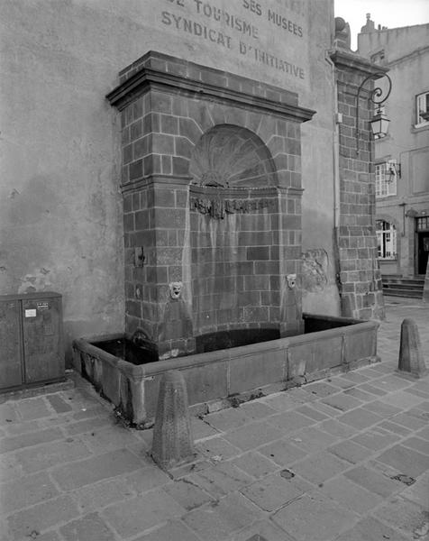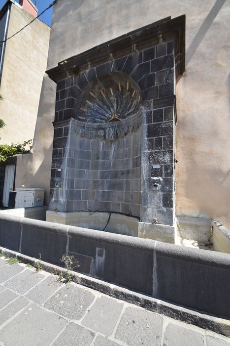 Cette fontaine fut adossée à l'emplacement des anciennes fortifications de la ville. De 1773 à 1776, les remparts furent démolis et les tours fortifiées qui marquèrent chaque porte furent alors remplacées par des piliers ornés de pilastres amortis en boule. La fontaine fut adossée à la nouvelle porte de Mozac. Le nom de "crapaud" vient du masque par lequel jaillit l'eau, mais il pourrait également s'agir de rappeler l'existence, à la fin du 18e siècle, d'un élevage de grenouilles rue Gomot.£La fontaine, édifiée par Claude François Attiret, se compose d'une grande arcade délimitant une niche concave. L'ensemble baigne dans un bassin rectangulaire alimenté par l'eau jaillissante de deux masques grimaçants plaqués sur chaque piédroit de l'arcade. Cette dernière présente une face unie, ornée seulement de deux moulures saillantes à hauteur d'imposte et de corniche, et formant une sorte de faux-attique. La niche est voûtée en coquille. Son trompillon est sculpté en tête de crapaud. Cet édicule, inspiré d'autres réalisations néo-classiques de Franche-Comté, est unique en Auvergne.