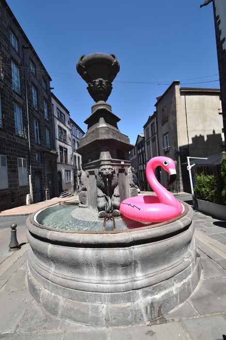 Elevée en 1614, cette fontaine se trouvait à l'origine à l'intersection des rues de l'Horloge et de la Charité. Transportée plus tard à son emplacement actuel, elle y fut reconstituée et vraisemblablement réduite. L'ouvrage comporte un bassin circulaire et un corps central. Les côtés du bassin présentent un profil galbé entre deux larges tores. Au milieu de ce bassin circulaire s'élève le corps central, de plan triangulaire, dont chaque face présente, à partir du niveau de l'eau du bassin, un panneau au cadre rectangulaire mouluré coupé en arc de cercle à chaque angle. Dans l'intervalle de ces faces, une statue de lion est engagée dans chacun des angles. Les trois lions sont accroupis, leurs pattes antérieures posées sur les pattes postérieures pliées, le corps dressé, la tête auréolée d'une crinière tendue en avant, l'eau s'écoulant de leur gueule. Au-dessus, règne un entablement souligné d'un bandeau et d'un filet, et surmonté d'une corniche en saillie. Sur le piedestal ainsi formé est posé un socle qui supporte une urne monumentale posée en couronnement.