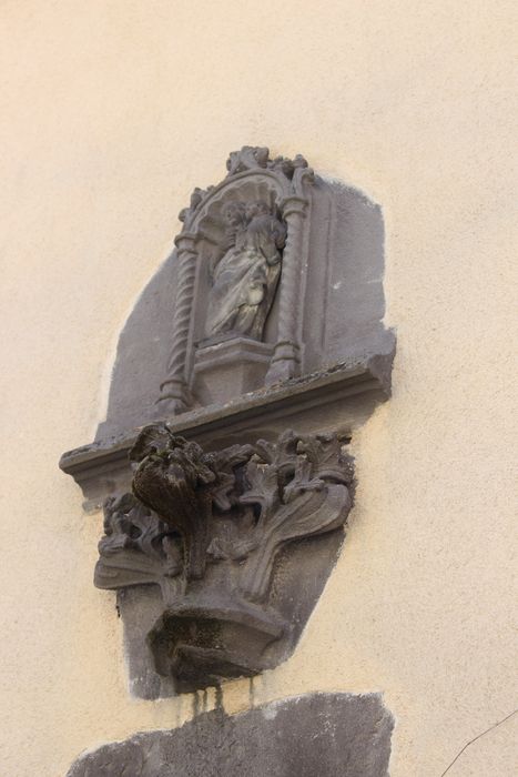 A l'angle, la façade comprend une statue de la Vierge semblant dater des premières années du 16e siècle. Elle représente la Vierge portant l'Enfant sur son bras. La statue est logée dans une niche surmontée d'une fine archivolte et ornée de chaque côté de deux petites colonnes torsadées.