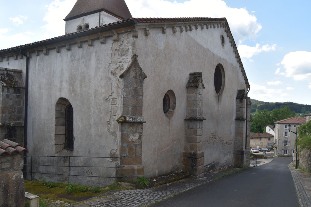 Eglise de la fin du 15e ou du début du 16e siècle, composée d'une nef de trois travées s'ouvrant sur des chapelles de bas-côtés et terminée par un choeur à abside polygonale. Chaque travée de la nef est voûtée d'ogives avec formerets et clefs sculptées. Des arcs doubleaux séparent chaque travée de la nef de la chapelle de bas-côté correspondante, hormis au côté sud de la travée précédant le choeur. Les chapelles latérales sont également voûtées. La façade méridionale s'ouvre par un portail en arc brisé, à trois voussures. Le linteau possède en son milieu une console polygonale sculptée sur chaque face d'une arcature flamboyante en accolade accostée de pinacles. Sur ce support est placée une statuette ancienne. Le tympan est ajouré d'un oculus entre deux baies tréflées. Le clocher d'époque moderne présente un étage ajouré de deux ouvertures géminées à arc en plein cintre et munies d'abat-sons, et se termine par une flèche.