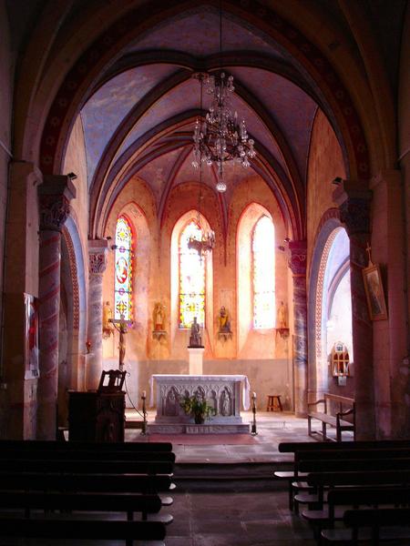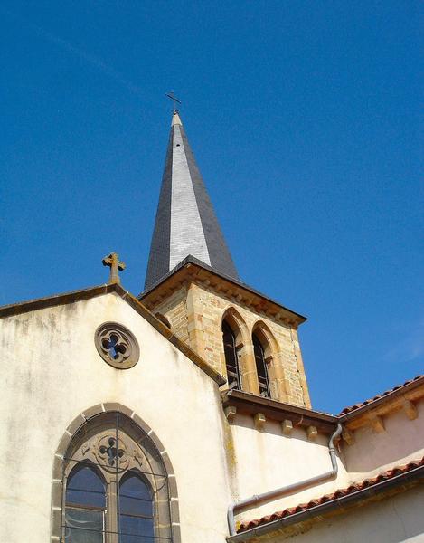 L'église fait partie d'un ancien château qui occupait le centre de l'ancien bourg. Sa partie occidentale est englobée dans les constructions de ce château. Cet édifice remonte à l'époque romane mais a été très remanié et voûté à l'époque gothique. Le dernier étage du clocher et sa haute flèche sont du 19e siècle. Corniches et chapiteaux romans. Eléments d'époque gothique dont le portail d'entrée sous le porche. Le plan présente une nef unique et deux petits collatéraux moins élevés. La nef se termine par une abside à trois pans, sans déambulatoire.