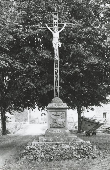 Croix érigée en 1894, composée d'un soubassement en rocaille sur lequel repose un emmarchement carré qui permet d'accéder à un piédestal constitué d'une base moulurée, d'un dé portant en bas-relief sur sa face Est une scène du Jugement dernier, et d'une corniche coiffée d'une doucine renversée formant plate-forme sur laquelle repose un demi globe servant de base à la croix métallique. Le fût de cette dernière est constitué de deux montants métalliques entre lesquels sont inserrés les instruments de la Passion.