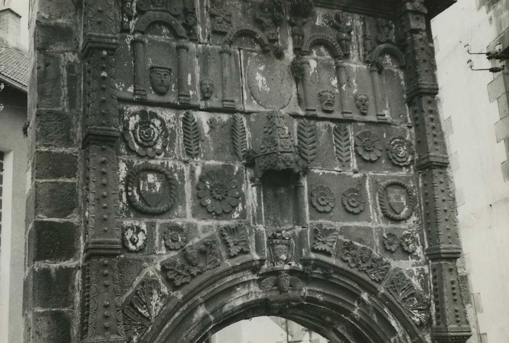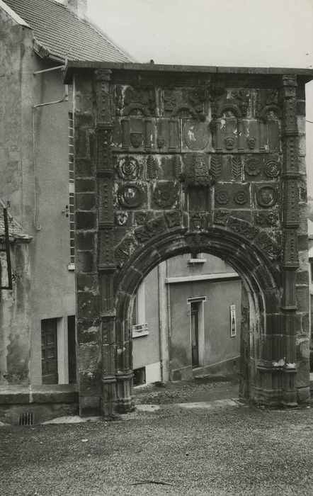 Lors de la construction de l'église actuelle, en 1873, le portail de l'ancienne église du 16e siècle a été réédifié sur la place du village. D'autres sources indiquent qu'il pourrait s'agir d'un élément d'un château démoli. Il allie certaines formes encore gothiques au répertoire de la Renaissance. Y figure le blason de Jean de Lévis, seingeur de Saint-Sauves à partir de 1595.£Ce portail, surmonté d'un mur formé du remploi de différentes sculptures, mesure 1, 90 mètres. Au-dessus du cordon d'archivolte mouluré d'un tore chargé d'un listel, qui surmonte l'arc en anse de panier, sont disposées des sculptures représentant des feuillages. A la clef de l'arc est sculpté un petit personnage nu, de part et d'autre de la tête duquel sont figurées des sortes de petites ailes. Ce personnage sert de culot à la tablette d'une niche dont les montants sont formés de colonnettes supportant le dais en forme de pyramide dont les faces ont un décor en bas-relief de masques, feuilles de marronnier, corolles, croix. Un socle sculpté d'un masque garnit la partie inférieure de cette niche. De part et d'autre des piédroits sont engagés de petits pilastres rectangulaires formés d'éléments superposés séparés entre eux par des bagues saillantes moulurées. Le mur limité par ces pilastres, l'ouverture du portail et la corniche supérieure, sont formés d'un assemblage de sculptures en bas-relief disposées selon deux registres. La moitié inférieure présente un décor formé de l'alternance ou de la succession de dix corolles de différentes tailles, de deux écus dans un cadre circulaire formé d'une tresse, et de quatre feuilles de fougère. Le registre supérieur est décoré de quatre arcatures à colonnettes dont les chapiteaux reçoivent les arcs surbaissés au décor sculpté en creux. Quatre masques humains sont disposés sous ces arcatures ou entre elles. Au-dessus figurent des personnages dans différentes attitudes, masques et motifs ornementaux.