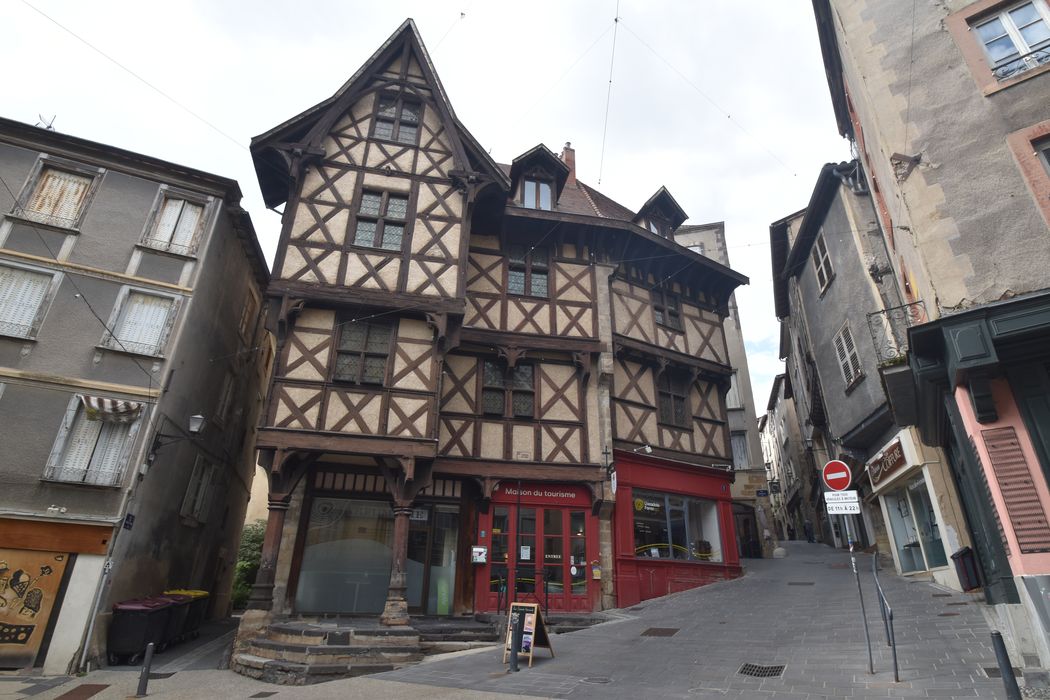 Construction de deux étages en pan de bois portée sur un rez-de-chaussée maçonné ouvert de boutiques, avec partie saillante à l'angle reposant sur deux colonnes isolées. A l'intérieur, l'édifice conserve quelques cheminées datant de son époque de construction.