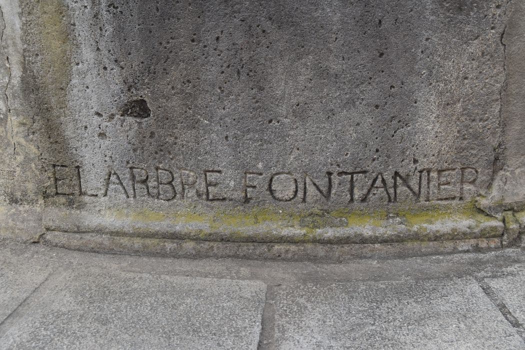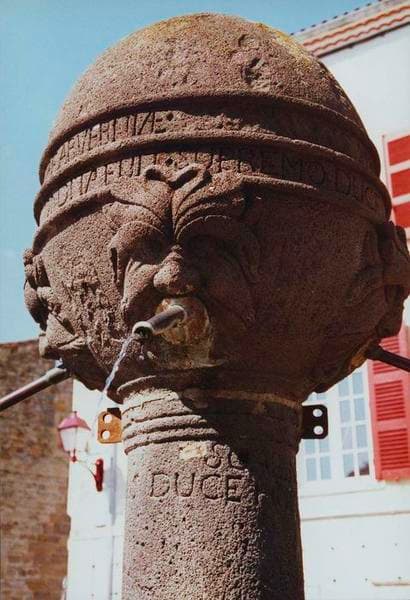Fontaine du 16e siècle comprenant un bassin circulaire à rebord mouluré saillant sous laquelle est gravée en creux d'une inscription latine. Un boudin se trouve sous cette inscription. Au centre de ce bassin circulaire formé par de larges dalles d'andésite se trouve un édicule dont la base carrée arrivant à hauteur des rebords du bassin supporte un fût circulaire sur lequel est posé un vaste récipient clos en pierre, ovale, dont la partie inférieure comporte, sculptés en relief quatre mascarons par les gueules desquels l'eau coule dans le bassin. Trois moulures saillantes à profil de boudin entre lesquelles est également gravée une inscription, se trouvent au-dessus des mascarons.