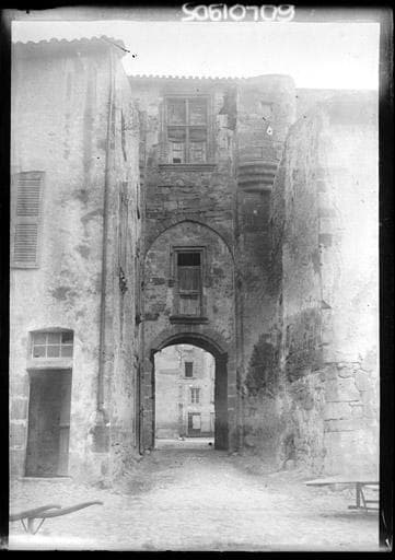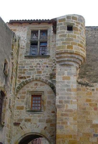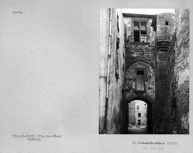Cette porche fortifiée est un vestige du palais des comtes d'Auvergne, reconstruit par Jean Stuart, duc d'Albanie, au début du 15e siècle. La porte est franchie de plein pied. La voûte du passage est en arc bombé. Des échancrures ont été aménagées pour le passage de la herse. Au-dessus de l'arc de la voûte se trouve une fenêtre haute et étroite à encadrement en pierre dont l'appuie forme saillie. Le linteau et les montants sont moulurés et s'appuient sur de petites bases prismatiques. Le second étage est en légère saillie sur un arc brisé tracé au-dessus de la fenêtre. Il comporte une grande fenêtre rectangulaire à appui saillant et mouluré, avec croisée de meneaux à moulures prismatiques. Cette porte est contre-butée de chaque côté par un contrefort supportant à hauteur de la fenêtre du deuxième étage une tourelle d'angle en encorbellement sur cul-de-lampe.