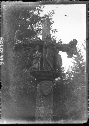 Croix du 16e siècle replacée sur un soubassement moderne. Elle se compose d'un socle mouluré, d'un fût flanqué de petits contreforts et de la croix proprement dite, à section prismatique et choux frisés aux extrémités des bras. Le Christ crucifié occupe une face ; la Vierge mère se trouve sur l'autre. Entre eux et au même niveau sont quatre personnages placés sous les bras de la croix. Chacun d'eux, ainsi que la Vierge, repose sur un cul de lampe spécial. Au-dessous de la Vierge est un écusson.