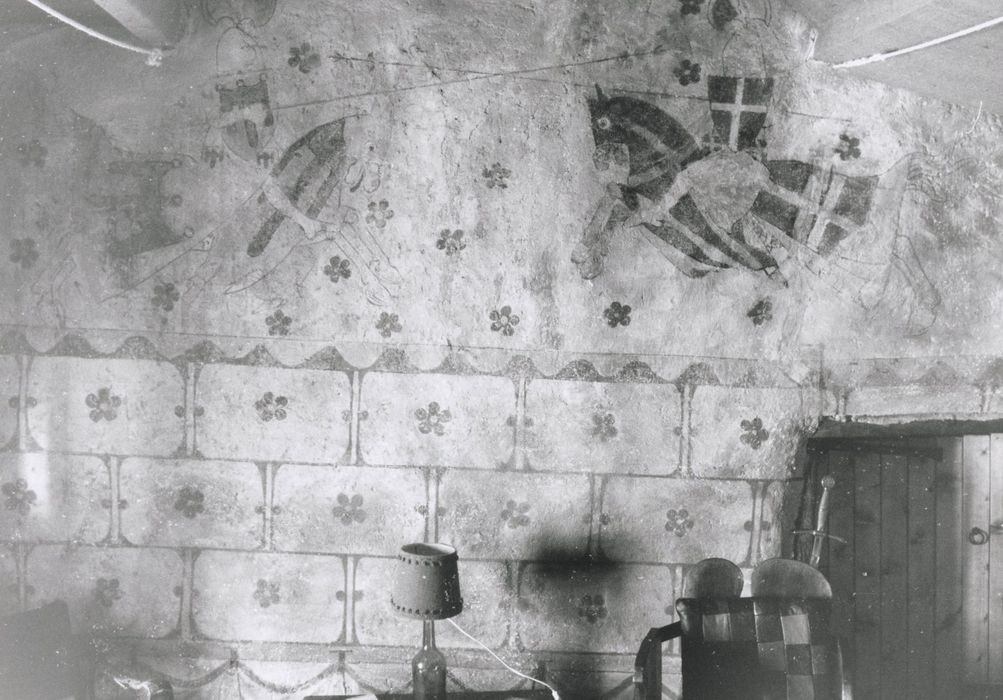 Aucun élément ne permet d'expliquer la présence d'un ensemble héraldique peint du 14e siècle dans cette maison. Selon l'hypothèse du docteur Toulemont dans son article de 1981, "Découverte d'une peinture héraldique en Auvergne", le cours de la rivière aurait enserré autrefois cette maison, l'isolant sur une île. Elle aurait de ce fait bénéficié d'une protection naturelle propice à l'implantation d'un prieuré ou d'une commanderie. L'existence d'un tel établissement est plausible, compte-tenu de la proximité de la commanderie de Chauliac dont il aurait pu être une dépendance. Cette peinture murale forme un ensemble important pour l'histoire du décor civil dans un petite maison noble du 14e siècle.