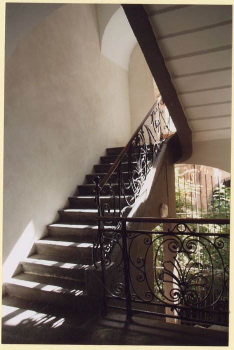 Les façades et toitures ; la cage d'escalier avec sa rampe en fer forgé (cad. HY 252) : inscription par arrêté du 23 mars 1990