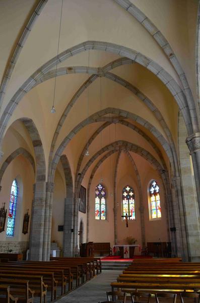 Cet édifice, reconstruit de 1899 à 1902, conserve un clocher-porche du 15e siècle exemplaire de cette région du Livradois : tour carrée, massive, épaulée par d'énormes contreforts angulaires à ressauts larmiers et chaperon en bâtière. Le portail à voussures et ébrasements garnis de niches (culots en coquilles servant de support autrefois pour des statues) est amorti par un gâble en accolade et des pinacles ornés de choux frisés. L'église primitive se composait, outre le clocher, d'un collatéral nord, d'une nef à deux chapelles latérales au sud, d'un choeur carré ouvrant sur une abside polygonale. £L'agrandissement de Barthélémy Sauzet reprend les modèles traditionnels de la région : piliers, chapiteaux, voûtes et remplages des baies. L'ensemble des fenêtres sont garnies de vitraux signés Francis Grand et Baratte.