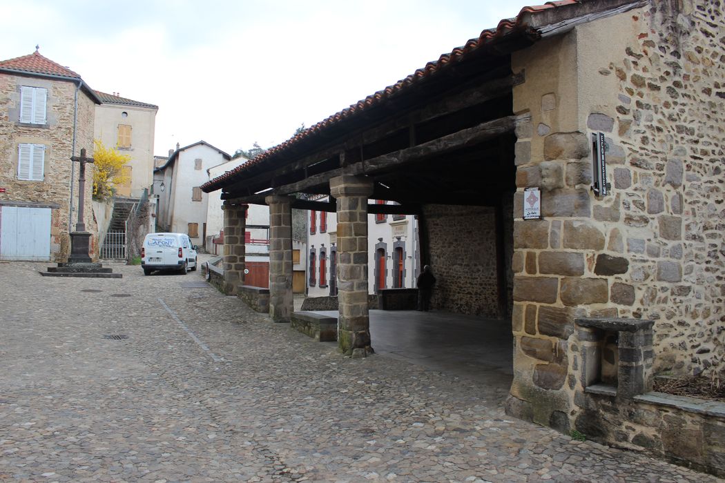 Foires annuelles créées en 1412 par H. de Montmorin. Edifice du 12e ou 13e siècle, couvert d'une charpente et poutres sur une seule travée dans sa largeur, soutenu par un mur dans sa partie postérieure qui surplombe un chemin descendant vers la basse ville. La face principale sur la rue d'arrivée est portée par des piliers reliés par une banquette. Ils portent un chanfrein sur leurs angles. Des tailloirs simples à chanfrein les couronnent. L'un d'eux est orné de billettes, rencontrées d'ordinaire sur des édifices du 12e siècle. Un mascaron est apparent à deux mètres de hauteur de la travée d'entrée.