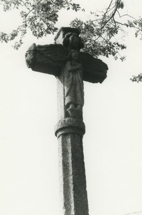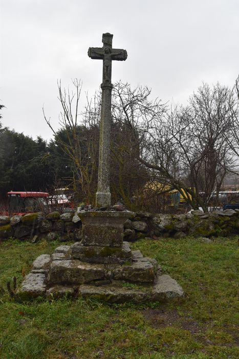 Cette croix porte aux extrémités des fleurons avec rosaces quadrilobées. Sur la face antérieure, statuette du Christ. Sur la face postérieure, statuette de la Vierge surmontée d'une tête d'ange aux ailes déployées. Sur un des pans de la base du fût, la date de 1631 est gravée ; AVE MARIA sur le second ; des inititales à demi effacées, probablement celles du donateur, sur le troisième.