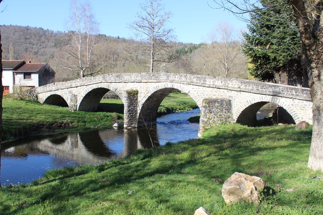 Pont datant probablement du 15e siècle, composé d'un dos d'âne à quatre arcades, avec éperons côté amont. Le pont mesure 2, 20 mètres entre parapets. Les arches sont de dimensions inégales et celle du milieu s'ouvre jusqu'à 3, 30 mètres au-dessus de la Sénouire. Les piles, protégées d'éperons, sont de puissance inégale. L'ouvrage devait desservir le château, construit à la même époque, et le prieuré-cure. Toutefois, la répétition des mêmes formes pendant des siècles ne permet pas de le dater avec précision. L'ouvrage aurait été restauré en 1850, sans doute après une crue.