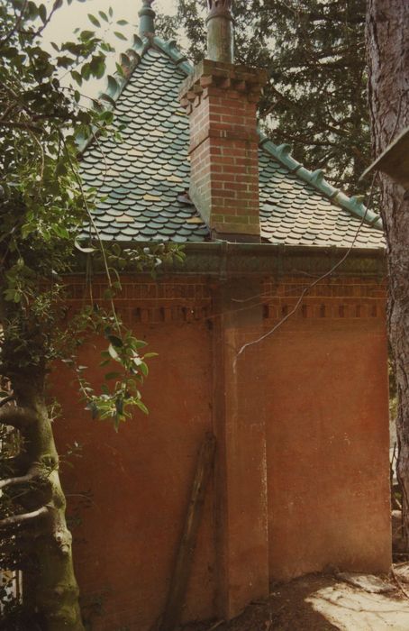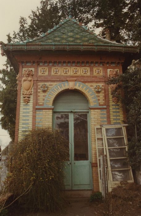 Fabrique de jardin 1900, entièrement polychrome sur ses deux faces. Il s'agit d'un pavillon provenant d'une exposition universelle ou inspiré d'un modèle d'Exposition, témoin de ce type d'architecture souvent destiné à disparaître. De plan carré, cette fabrique de jardin présente un décor polychrome fait de briques émaillées et de terres cuites. La base de la modérature est constituée par une structure de brique naturelle s'ordonnant en deux jambes accostant une arcade centrale. Des chaînes horizontales divisent en élévation le parement en trois registres superposés. Le plein de chaque jambe accostant l'arcature est délimité en table par des briques demi harpées. L'arcade d'une des faces est fermée par une balustrade servant d'appui à une fenêtre. Le jambage de chaque baie est constitué par un appareil de brique ocre clair, présentant sur sa face externe une alternance de briques bleues. Une imposte et une clef saillantes soulignent l'arc plein cintre dégageant des écoinçons ornés. Un deuxième bandeau accosté de têtes de lions en terre cuite délimite un entablement au-dessus de chaque arc. Un bandeau d'architrave surmonte chaque arcade, accosté de deux petites tables situées à l'aplomb des jambes. Le toit en pavillon à égoûts retroussés présente une bordure de rive et des antéfixes angulaires rechampis de bleu. Chaque versant est orné de tuiles en écailles émaillées formant un quadrillage de losanges dont le centre est souligné de jaune.
