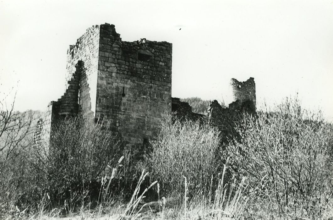 Au 13e siècle, le château primitif est aménagé pour améliorer sa défense en l'adaptant aux progrès de l'architecture militaire, notamment avec l'adjonction d'éléments en surplomb. A partir de 1782, le château perd progressivement sa fonction résidentielle. En 1827, il est loué à un fermier et tombe en ruine. Autrefois, une enceinte fortifiée devait en défendre l'accès. Aujourd'hui, le château se compose de deux parties distinctes : un châtelet fortifié de plan massé et une tour pentagonale. Le système défensif global de l'édifice (meutrières, bretèches, tours de flanquement en surplomb, éperon) est entièrement tourné vers le sud-ouest, seul côté de terre ferme à protéger. La tour comportait autrefois quatre niveaux dont le dernier est aujourd'hui arasé. Le rez-de-chaussée est encore partiellement voûté en berceau brisé. Au nord de la tour se trouve la porte d'entrée surmontée de fenêtres aux chambranles arrachés ; à l'est subsistent des fenêtres en plein cintre qui permettent de dater cette construction du 12e ou 13e siècle. £Le corps principal, de plan carré, est constitué d'une enceinte pourtournée autrefois par un chemin de ronde et abritant deux corps de logis adossés en appentis contre les courtines nord et sud, de part et d'autre d'une cour intérieure. La courtine est interrompue par une tour rectangulaire en avancée dont l'appareil est percé à hauteur du chemin de ronde par une archère-canonnière, et au niveau supérieur par des meurtrières jumelées. Une échauguette permet la communication du chemin de ronde occidental avec l'intérieur de la tour. L'autre extrémité du corps principal est flanquée par une tourelle en surplomb.