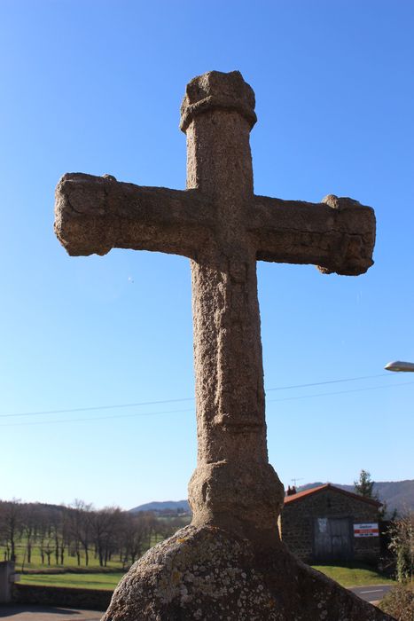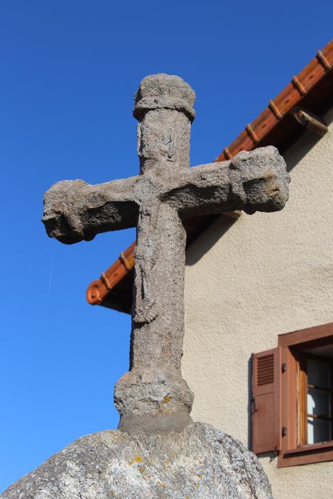 Croix du 15e siècle qui devait primitivement être supportée par un fût disparu. La croix est de section hexagonale. Les croisillons sont terminés par des ornements à fleurons isolés par une astragale. Sur la face antérieure est sculpté le Christ surmonté d'un lambe. Sur la face postérieure est sans doute sculptée la Vierge, les mains jointes, la tête inclinée, portant des vêtements aux plis droits et rigides. Un commencement de chapiteau, attenant à la croix, se voit au bas.