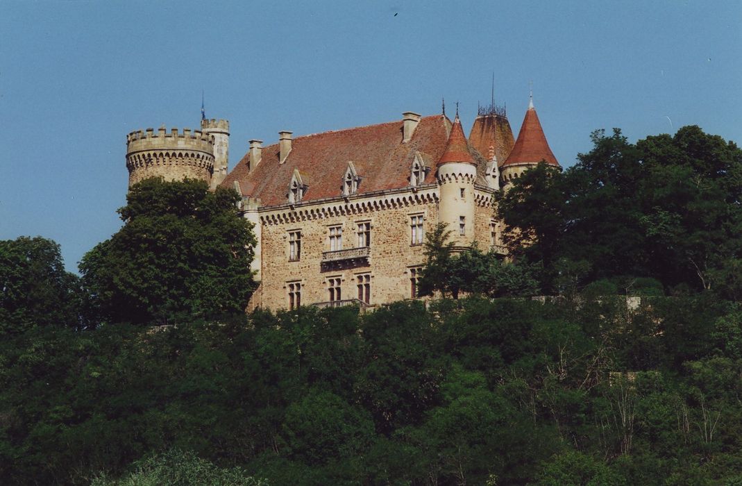 A partir d'un donjon circulaire du 12e ou 13e siècle, construction au 15e siècle d'un château articulé en deux ailes perpendiculaires. Aménagements et décors des 17e-18e siècles. Remaniement à la fin du 19e pour rendre l'édifice plus confortable tout en accentuant son caractère médiéval par un style néo-gothique. Travaux effectués par l'architecte Honoré Vianne.