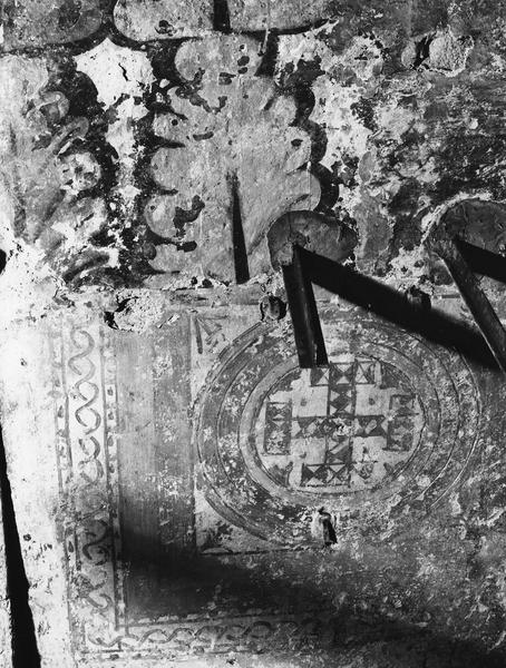 Ancienne chapelle castrale du 13e siècle, devenue église paroissiale, remaniée au 15e siècle. C'est un sanctuaire à nef unique et abside à pans coupés dont la construction peut remonter au 13e siècle, modifié au 15e par l'agrandissement de la fenêtre axiale de l'abside, et surtout par l'apport de voûtes sur croisées d'ogives de profils très fins. Il possède un décor de motifs végétaux, des croix de consécration, des litres funéraires avec ou sans armes et du faux appareil à la voûte. Les clefs de voûtes portent des éléments figurés : figure de femmes dans l'abside, et blasons. La technique de ces différents éléments semble s'étendre du 13e au 17e siècle. Quatre niveaux de peintures murales superposés. Le niveau inférieur comprend un ton ocre rouge sur les voûtes du 15e siècle, un faux appareil ocre rouge et brun entourant les deux baies du choeur et dans les ébrasements, huit croix de consécration inscrites dans des carrés, un grand arbre en bistre sur le mur sud. Le deuxième niveau présente une litre funéraire faisant le tour de la chapelle et portant des armoiries ; le troisième, un fragment de monument funéraire à la base du mur sud (fin 16e) ; le quatrième, de grosses feuilles d'acanthes rouge et jaune bordées de noir.