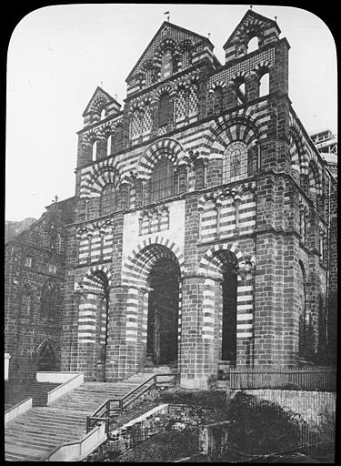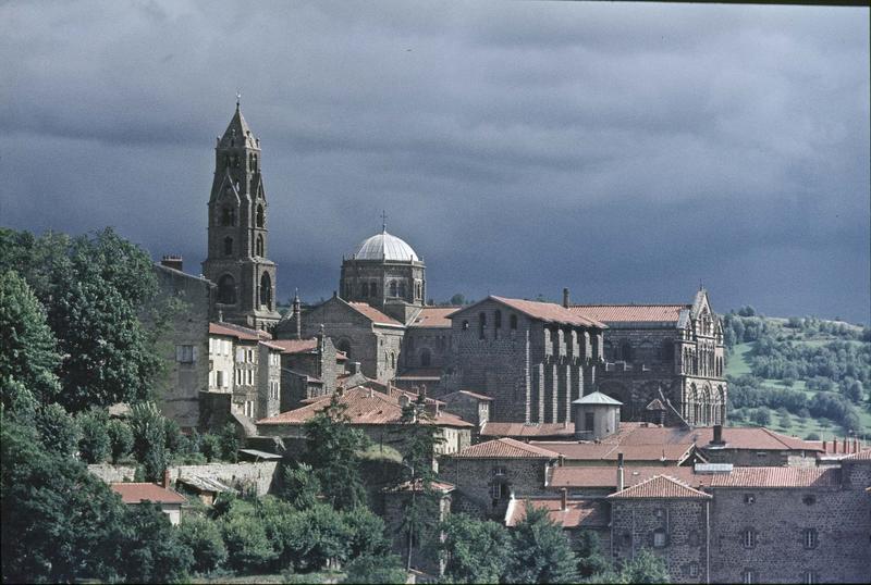 Université Saint-Mayeul : datation non précisée. Cathédrale : 10e siècle, 19e siècle. Bâtiments des machicoulis et cloître : 12e siècle, 13e siècle.£Le siège épiscopal fut transféré de Saint-Paulien au Puy au cours du 7e siècle. L'église du Puy a été construite sur un sanctuaire païen par l'évêque Scutaire avant 493. Dès 1020, les pèlerinages étaient fréquents. La ville abdiqua son nom d'Anicium pour prendre celui de Puy-Sainte-Marie.£La cathédrale actuelle a été bâtie à l'emplacement d'une basilique rectangulaire dont l'abside devait présenter intérieurement sept pans avec une suite d'arcades aveugles. Les supports des arcs étaient sans doute des colonnes monolithes en granit ou marbre. Des revêtements de mortiers décorés de méandres et d'oves moulés en relief semblaient avoir recouvert les parois intérieures. La muraille était couronnée par de grandes pièces sculptées d'une corniche antique. Ce chevet détruit remonterait à la fin du 11e siècle. L'édifice subit plusieurs restaurations à partir du 14e siècle. Au cours de la Révolution, autels et objets du culte sont détruits. En 1840, la cathédrale menace ruine. En 1865-1866, Mimey réalise des travaux qui mettent à jour les vestiges d'une église antérieure. Tout a été reconstruit, hormis la troisième et la quatrième travées, et une partie du croisillon nord. En dehors du chevet et de la tour centrale, rebâtis d'une façon fantaisiste par les architectes Mimey et Mallay, les indications fournies par les constructions primitives semblent avoir été assez bien suivies. £La cathédrale se compose d'une nef de six travées flanquée de bas-côtés voûtés d'arêtes, d'un transept terminé à chaque extrémité par deux absidioles jumelles et d'un chevet carré. Chaque travée de la nef est recouverte d'une coupole octogonale barlongue portée sur des trompes en cul-de-four. La cathédrale a été construite en trois fois. La partie la plus ancienne comprend le chevet, le transept et les deux dernières travées. Vers le milieu du 12e siècle, l'édifice est agrandi. De cette période datent les troisième et quatrième travées. Des perfectionnements sont apportés dans la structure et l'arc brisé apparaît. La partie la plus récente de la cathédrale part de la deuxième travée, postérieure d'un quart de siècle à la précédente. Le plan des piliers devient cruciforme. £La sculpture des chapiteaux est assez simple. Dans les deux parties les plus anciennes, ce sont des feuilles et des entrelacs, des hommes ou des animaux au milieu d'une végétation, des serpents ou des basilics buvant dans un vase. Aux deux premières travées, la sculpture se complique. Quelques restes de peintures murales à l'étage supérieur du bras nord du transept.£Le long du mur nord de la cathédrale est adossé un cloître rectangulaire, profondément remanié. La galerie méridionale a été démolie au 18e siècle et la partie extérieure a été presque entièrement reconstruite. Les autres parties n'ont subi que des remaniements. Le cloître s'ouvre sur un préau par cinq arcades sur les deux côtés les plus petits et par dix sur les plus longs. Le mur qui surmonte les archivoltes est décoré d'une mosaïque formée d'une suite de losanges blancs, noirs et rouges. Les galeries remontent aux 11e et 12e siècles. Les chapiteaux sont ornés de feuillages et de scènes historiées.