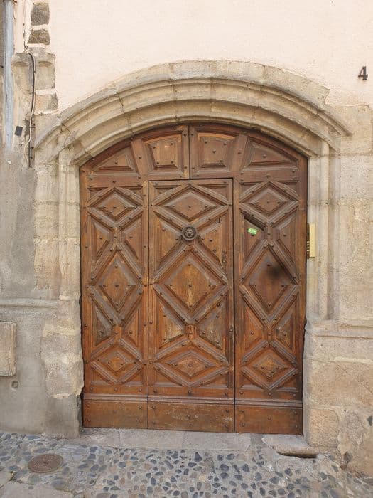 Avant les remaniements subis par la rue du Cardinal de Polignac, lors de l'agrandissement des jardins de l'évêché, une maison se trouvait à l'extrémité. Des sculptures de la fin du 15e siècle, écussons et niches encadrées de débris de colonnettes prismatiques en provenant, ont été recueillis. La porte proviendrait de cette maison détruite. Il s'agit d'une porte cintrée, à bossages, impostes, et clef en saillie. Menuiserie d'époque à petits panneaux et pointes de diamant qui rappelleraient la fin du 16e ou le début du 17e siècle.