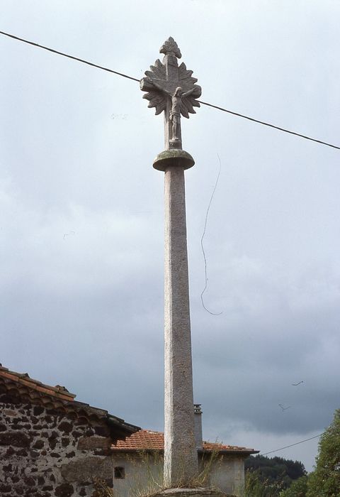 La croix n'est pas antérieure au 18e siècle et remonte même peut-être au début du 19e. Le socle carré représente plus d'un tiers de la hauteur totale. Le fût, légèrement conique, porte le sommet du croisillon. Un chapiteau semi hémisphérique formant liaison entre fût et croisillon, est gravé d'une série continue de palmettes. Le croisillon de section carrée portait, à chacune de ses extrémités, une palmette du même type que celle qui a été replacée récemment au sommet. La liaison des pièces devait se faire par emboîtement. Entre chaque bras du croisillon, une série de trois flammes donne à l'ensemble forme circulaire. Un Christ aux bras étendus et aux jambes droites est représenté en haut relief.
