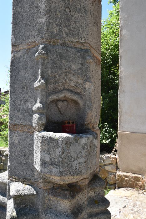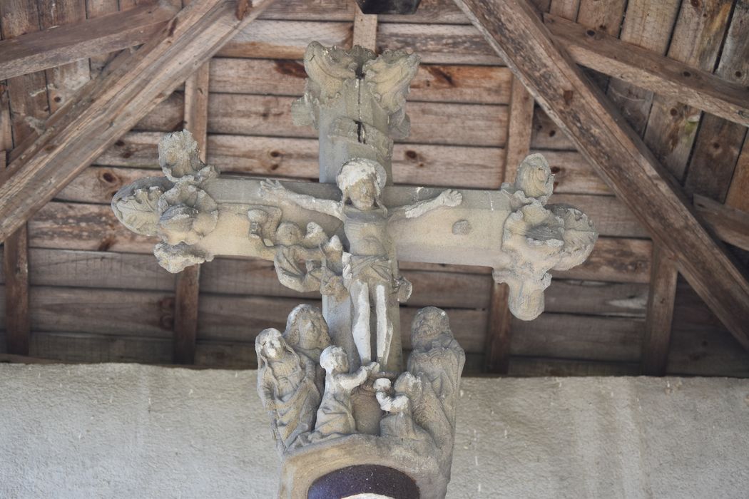 Croix abritée par un auvent à charpente que supportent un mur plein, un pilier partant de terre, et un autre d'une sorte de mur d'appui en loggia. Les piliers, dont le plus important comporte un bénitier, sont prismatiques. Le Christ est entouré de deux anges. En adoration à ses pieds, les Saintes Femmes. La Vierge est soutenue par un personnage à la chevelure abondante. Au revers, Vierge à l'Enfant, dont la robe est soutenue par des anges.