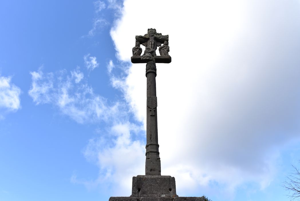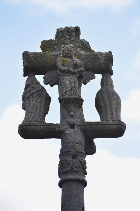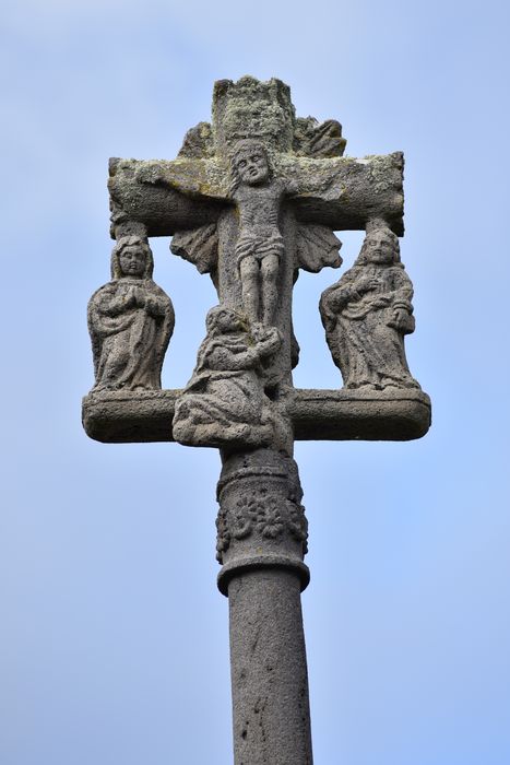 Sur la croix est figuré le Christ, dont la tête inclinée sur l'épaule droite est surmontée d'un lambel. La Vierge agenouillée lui tient les pieds. Sur une plate-forme parallèle à la croix sont placées deux statuettes de chaque côté : Saint-Jean agenouillé et tenant un livre ; Sainte-Madeleine agenouillée les mains jointes. L'intersection des croisillons est ornée de rayons. Le chapiteau est orné de pampres et de grappes. Le fût est cylindrique dans la moitié supérieure et hexagonal dans la moitié inférieure. Il porte un écusson sur lequel sont gravés des signes effacés. La base à six pans est ornée d'un chanfrein et de petits sujets en relief.
