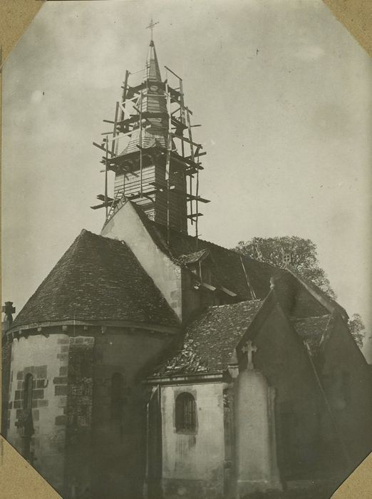 Eglise romane de l'ancien diocèse d'Autun, composée d'une nef sans collatéraux, plus large au sud dans sa partie occidentale, couverte d'un berceau brisé, raccordée à une abside en hémicycle. Deux chapelles ont été ajoutées au 15e siècle. Une flèche octogonale de charpente, couverte de bardeaux, datée du 16e siècle, se dresse en avant de l'abside.