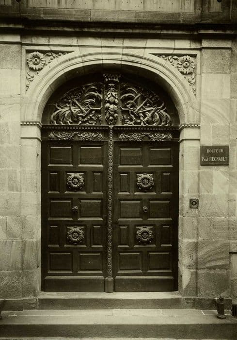 Exemple de menuiserie du 16e siècle, la porte est constituée de deux vantaux comprenant chacun six panneaux, avec rosaces sculptées, et imposte à cintre surbaissé sculptée à jour de guirlandes et motifs de fruits.