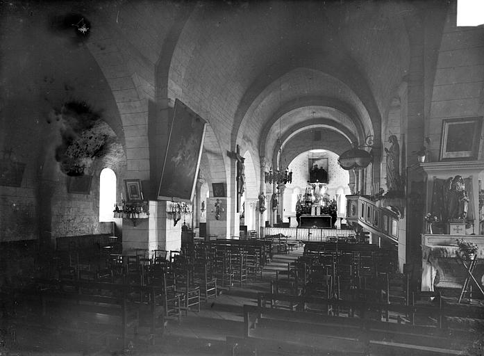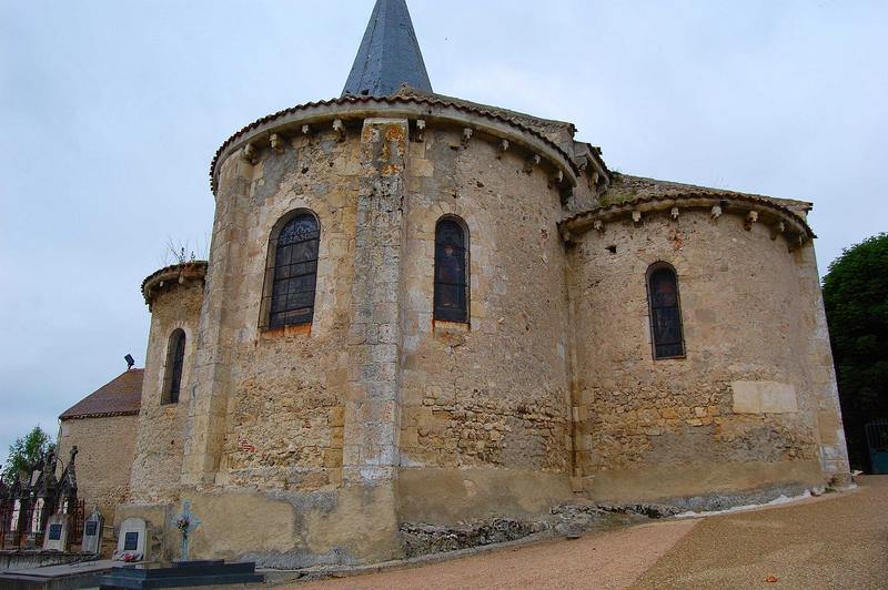 Eglise du 12e siècle, avec cinq travées voûtées en berceau brisé, sans transept, une travée droite précédant l'abside en hémicycle. Les bas-côtés sont voûtés en quart de cercle sur doubleaux brisés.