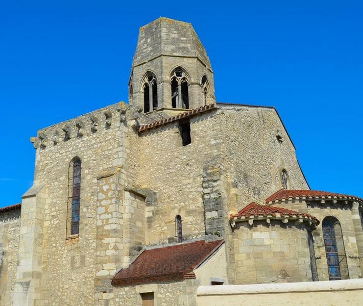 Edifice du milieu du 12e siècle, composé d'une nef de quatre travées avec bas-côtés, de deux transepts avec clocher et flèche en pierre sur la croisée, d'un choeur d'une travée avec bas-côtés et d'un sanctuaire de plan semi-circulaire flanqué de deux absidioles de même forme. La nef, les transepts, la travée du choeur sont couverts par des berceaux d'ogives. Les bas-côtés présentent des voûtes d'arêtes. La travée de la croisée est voûtée en ogive sur nervures. L'abside centrale et les deux absidioles sont voûtées en quart de sphère. La chapelle qui s'ouvre sur la dernière travée du bas-côté gauche de la nef, et la tourelle d'escalier dans l'angle du transept nord et du bas-côté du choeur, sont de la fin du 15e siècle. Le clocher et la flèche ont été rebâtis à la fin du 13e siècle. Il ne subsiste aujourd'hui que l'étage du beffroi, de plan octogonal, et un tronçon de la flèche. Au transept sud, restes de corbeaux de machicoulis établis au début du 16e siècle, qui faisaient partie de la défense de la ville. Les chapiteaux des piles sont ouvragés.