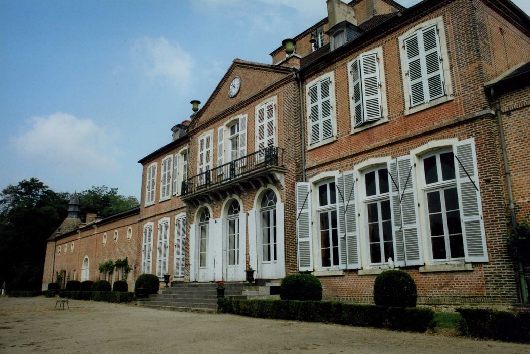 Edifice mêlant une architecture française avec une influence anglo-saxonne ou rhénane. Au Moyen-Age, un château aux angles garnis de tours s'élevait sur une ancienne voie romaine. Le château est précédé au nord par une cour d'entrée autrefois ordonnée à la Française, tout autour de laquelle s'ordonnent symétriquement les communs. Au sud de la cour, se trouve le château, de plan rectangulaire à un étage au-dessus du rez-de-chaussée, au centre des bâtiments fermant la cour. Il est accosté par des constructions allongées. Les tours circulaires et les bâtiments sont ornés de briques polychromes. Les intérieurs sont caractéristiques de la seconde moitié du 18e siècle. La partie centrale du château est occupée au rez-de-chaussée par un vestibule d'entrée nord ouvrant sur une cage d'escalier, précédant un vaste hall au centre duquel s'élèvent deux colonnes doriques. La salle à manger comporte un décor de strucs peints Louis XVI et Empire. Le salon possède une cheminée en calcaire Louis XV. Une petite pièce comprend un décor de boiseries et une cheminée présentant la particularité d'offrir, au centre de son linteau, un arbre de la liberté sculpté au moment de la Révolution en remplacement du motif originel. La chapelle possède un décor stuqué du 18e siècle, et une plaque de fondation datée 1628. Une réserve zoologique est installée dans le domaine du château.