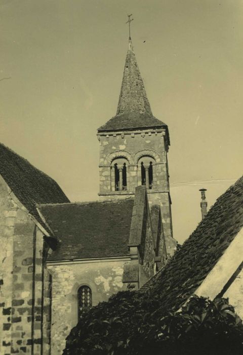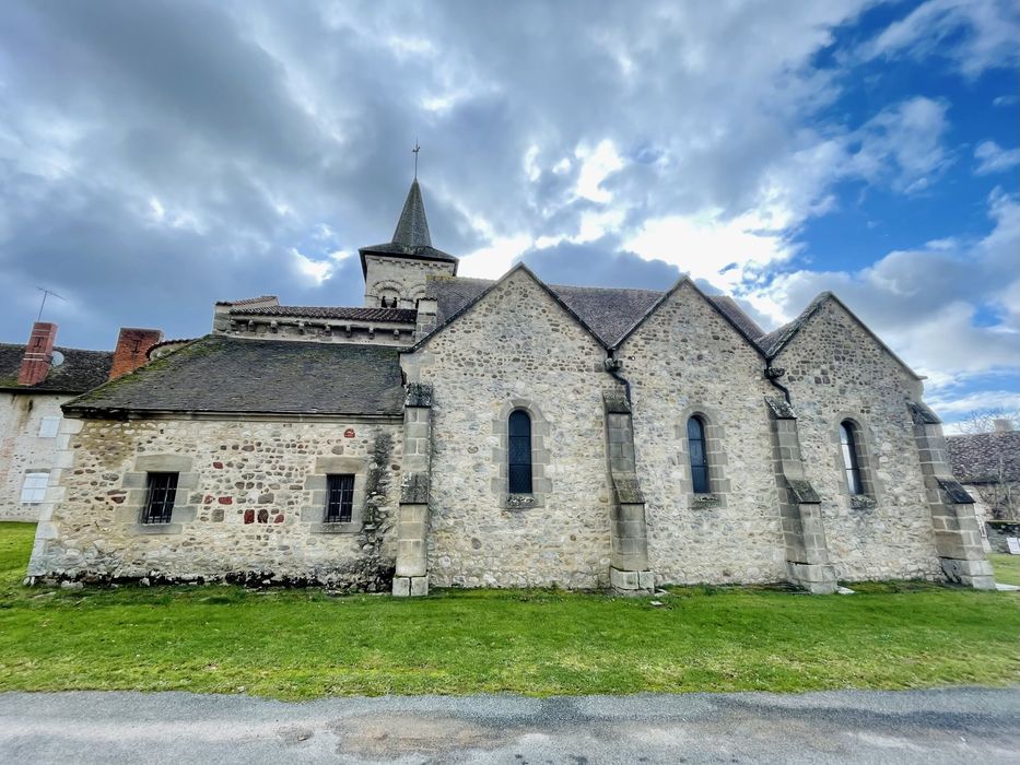 Possession ancienne de l'abbaye de Saint-Denis à laquelle elle fut restituée une première fois en 802 par Charlemagne, une seconde fois au 11e siècle pour faire partie du patrimoine du prieuré de la Chapelaude. Au 16e siècle, passe parmi les dépendances du prieuré de Benevent, en Limousin. Edifice roman composé primitivement d'une seule nef de deux travées et d'un trnsept saillant sur lequel ouvrait un choeur précédant une abside en hémicycle, flanquée d'un clocher. Les collatéraux datent de l'époque moderne. La nef est actuellement terminée par une charpente, mais primitivement, par une voûte sur doubleaux reposant sur les colonnes encore en place dans les murs latéraux. Le clocher carré est percé sur chaque face de son étage de deux baies en plein cintre, recoupées chacune par une colonnette et surmontées d'un double cordon de billettes. La partie supérieure, couronnée d'une flèche, remonte au 17e siècle.