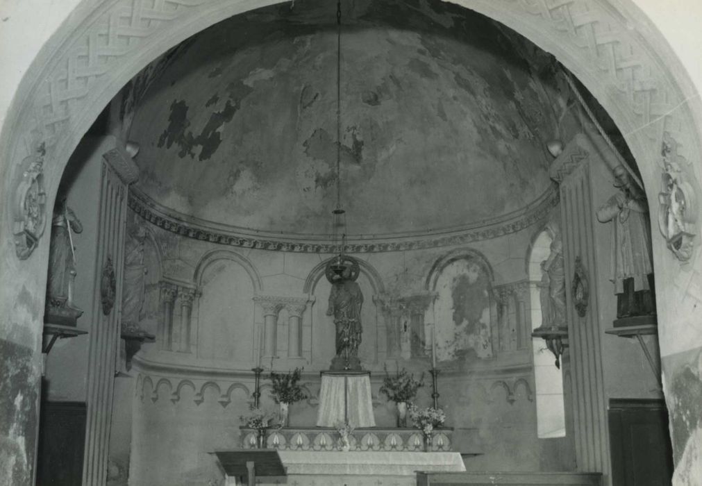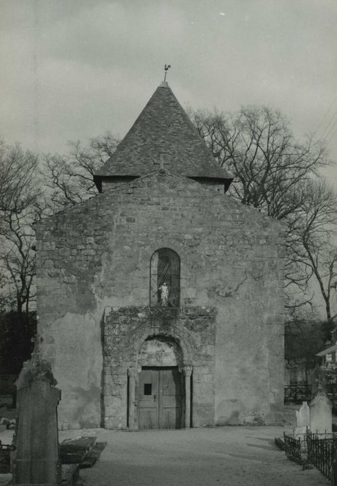 Reconstruite au 12e siècle et composée d'une nef unique de deux travées, d'une courte travée de choeur, voûtées en berceau, et d'une abside voûtée en cul-de-four, l'église porte témoignage, par son portail occidental, de l'existence d'un sanctuaire antérieur à l'époque pré-romane. Le tympan porte un décor à entrelacs, altéré à une époque ultérieure par l'incrustation d'une pierre armoriée. Le chapiteau de droite montre un décor de pommes de pin ou de grappes de raisin très stylisées. Les entrelacs ainsi que le tracé en fer à cheval de l'archivolte peuvent laisser supposer que ce portail remonte à l'époque carolingienne. Le clocher date du 17e siècle. L'intérieur porte un décor peint néo-roman.