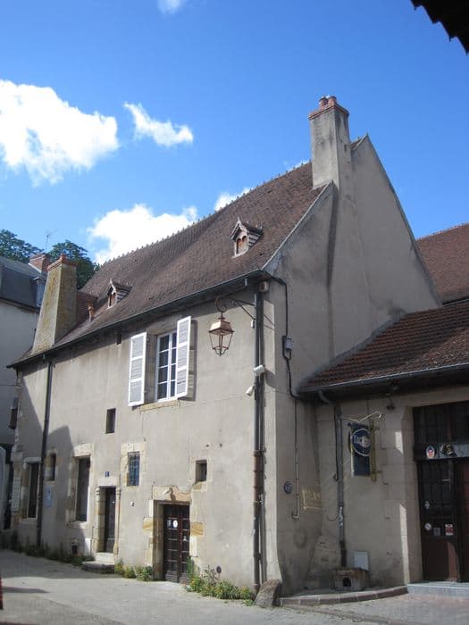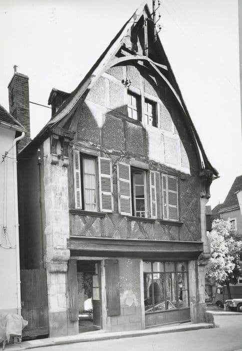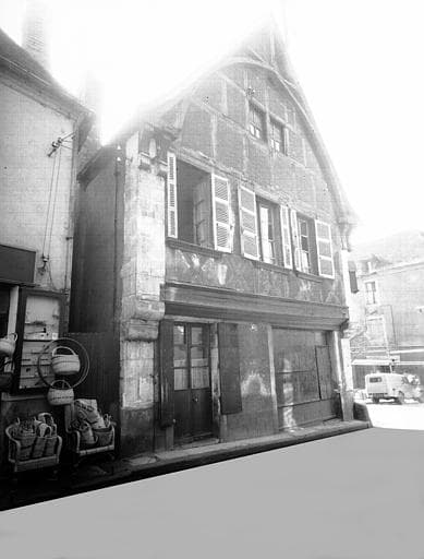 Edifice du 15e siècle, dont les deuxième et troisième niveaux sont en encorbellement. La façade présente deux angles en pierre de taille interrompus par de gros corbeaux, une porte et une devanture. Au premier niveau, ces deux percements sont surmontés d'une grosse poutre en bois, portant les colombages en X, placée en tables sous les trois fenêtres du premier étage. Au troisième niveau, le colombage est rectangulaire. Un arc ogival couronne ce pignon, reposant à ses extrémités sur des doubles corbeaux et s'inscrivant dans le triangle constitué par le toit à deux pans et le mur. La façade longitudinale présente une lucarne avec accolade du 15e siècle, une porte avec pilastre et imposte sur le linteau (16e siècle ?) et une fenêtre au chambranle chamffreiné.