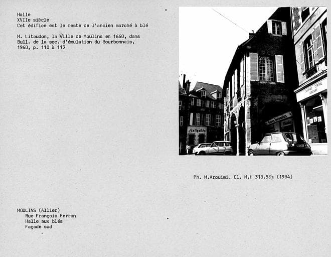Reste de l'ancien marché à blé, bâti selon la tradition par Mansart. L'édifice comprend trois arcades sur la rue François Péron, et cinq sur la rue Diderot. Ce bâtiment est un exemple de la construction en briques et pierres, caractéristique de l'architecture moulinoise du 17e siècle.