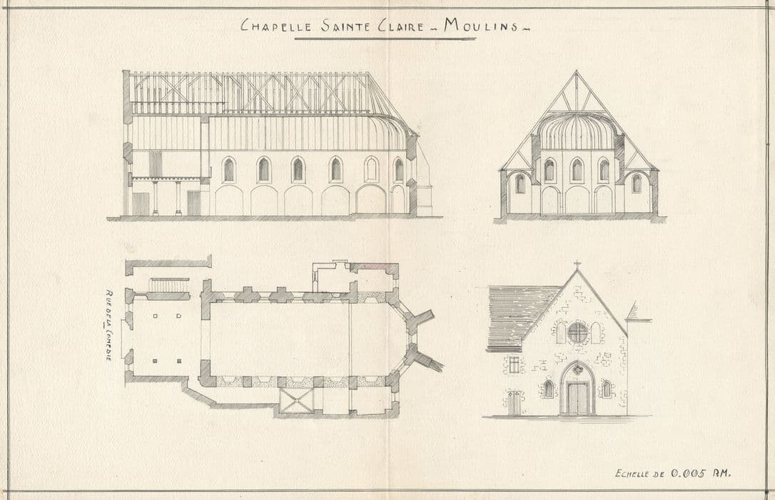 Fondation du couvent des Clarisses par Marie de Berry, épouse du duc Jean Ier, en 1421. Les bâtiments claustraux furent presque totalement reconstruits de 1685 à 1691. Le couvent fut vendu en 1793 comme bien national et servit de prison pour les prêtres et religieux réfractaires puis pour les femmes. La chapelle servit de théâtre de 1797 à 1847. En 1820, la ville la rachète et l'édifice est rendu au culte en 1854. La chapelle se compose d'une nef de quatre travées, précédée d'une troisième travée réservée à la tribune. Le choeur polygonal est flanqué de deux chapelles latérales. Au sud, communiquant avec la nef, s'étend un bas-côté dont deux travées sont voûtées et deux autres plafonnées. La voûte de la nef, à douves, se termine sur le choeur par des arcs de cloître contrebutés à l'extérieur par des contreforts. Le clocher qui s'élevait à cheval sur le mur de refend de la tribune a été démoli au début du 20e siècle.