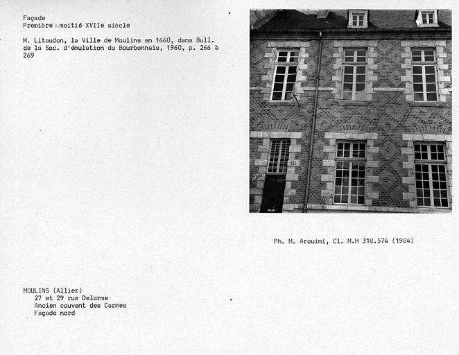 Ensemble d'éléments construits du 16e au 18e siècle. Le couvent a été fondé en 1350 à l'emplacement d'une chapelle dédiée à Notre-Dame de Pitié. Aux deux extrémités de l'église saint-Pierre s'appuient les corps de logis limitant l'ancien préau sur lequel s'ouvrait le cloître. Un ensemble de baies ouvre sur le préau, en plein cintre avec clef en saillie, moulurées sous un larmier. Leurs retombées se font sur des piliers cubiques à chapiteaux doriques. Chacune de ces baies est construite en briques, offrant une polychromie obtenue par des briques noires formant losanges. Une corniche de briques, formée de quatre plate-bandes superposées en saillie, couronne chacune des façades sur le préau. La façade rue Delorme s'ouvre par un portail monumental au seuil surélevé de trois marches. L'arc en plein cintre, à clef de voûte en saillie, est appareillé en bossages, ainsi que les piedroits contre lesquels sont engagés des pilastres supportant, par des chapiteaux ioniques, un entablement décoré d'un triglyphe sur rangée de gouttes. De part et d'autre de cette façade allongée au midi fait saillie une aile ou pavillon. L'aile est, qui est dans le prolongement du choeur et de l'étage surmontant ce dernier, est plus élevée d'un étage que le corps de logis à l'extrémité duquel elle fait saillie.