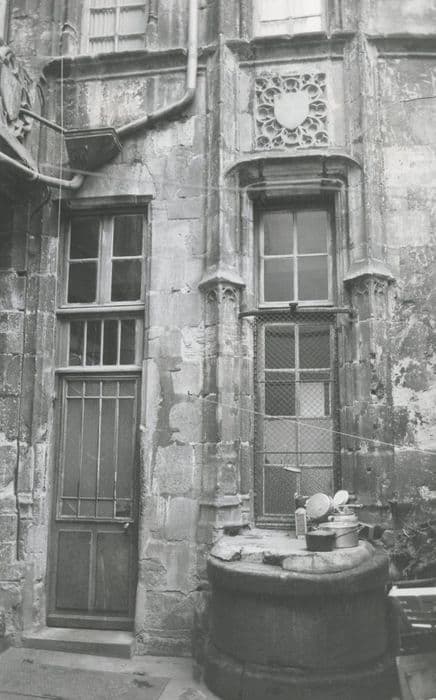 Maison du 15e siècle dont trois façades sur la cour intérieure présentent un décor de style flamboyant. L'encadrement d'une des fenêtres est mouluré d'un tore dégagé par des cavets et posé sur bases prismatiques. De part et d'autre des montants s'élèvent des pilastres triangulaires interrompus aux 2/3 de leur hauteur par un larmier en saillie au-dessus de deux arcs tréflés. Au-dessus du linteau, un cordon en larmier, arrondi à ses extrémités, joint de part et d'autre ces pilastres qui se continuent vers le haut. La seconde fenêtre possède le même décor. Les linteaux de ces deux fenêtres sont surmontés d'un panneau sculpté en bas-relief à l'intérieur d'un cadre de moulures formé par les pilastres sur les côtés et par le cordon d'appui de l'étage à la partie supérieure. Une seconde façade présente, sur la partie comprise entre une fenêtre et la porte, deux écus sculptés dont chacun est placé au centre d'un quatrelobe dont chaque lobe inscrit un arc tréflé. Une troisième façade présente également des éléments sculptés intéressants. A la suite de cette partie construite en pierre s'étend, à l'étage, une galerie dont l'ossature est à pans de bois, portée sur une sablière décorée à sa partie supérieure d'un cordon mouluré.