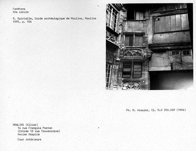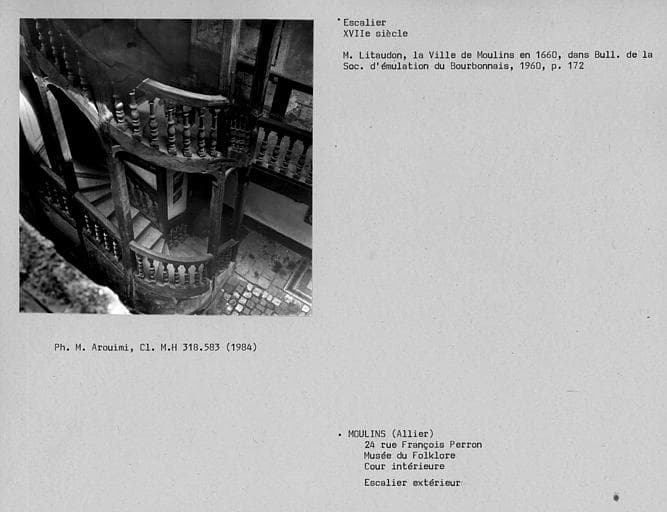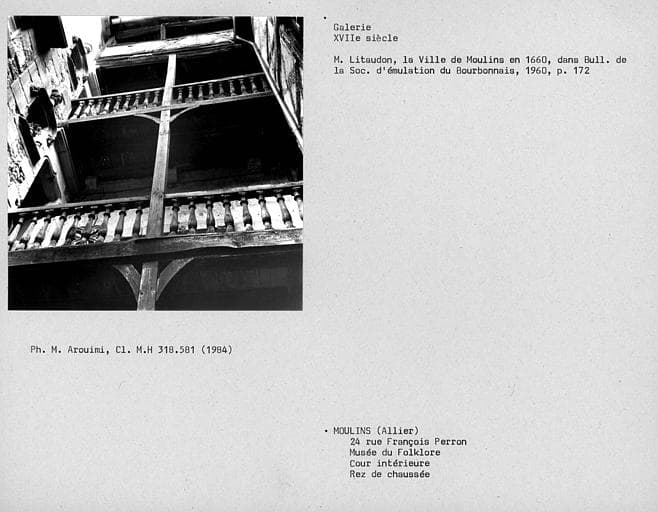 Maison, rue des Orfèvres : 15e siècle ; Maison, place de l'Ancien-Palais : 17e siècle. L'immeuble faisait partie du groupe des maisons de ban dans lesquelles le duc de Bourbon faisait vendre ses vins. La maison comprend un escalier en bois, rare exemple d'escalier en bois à balustres moulurés subsistant à Moulins. Il est disposé autour d'un noyau creux, dans une cage rectangulaire entièrement ouverte sur l'extérieur, et dont la charpente repose sur les poteaux d'ossature. La balustrade et la main courante se prolongent sur les galeries d'étages.