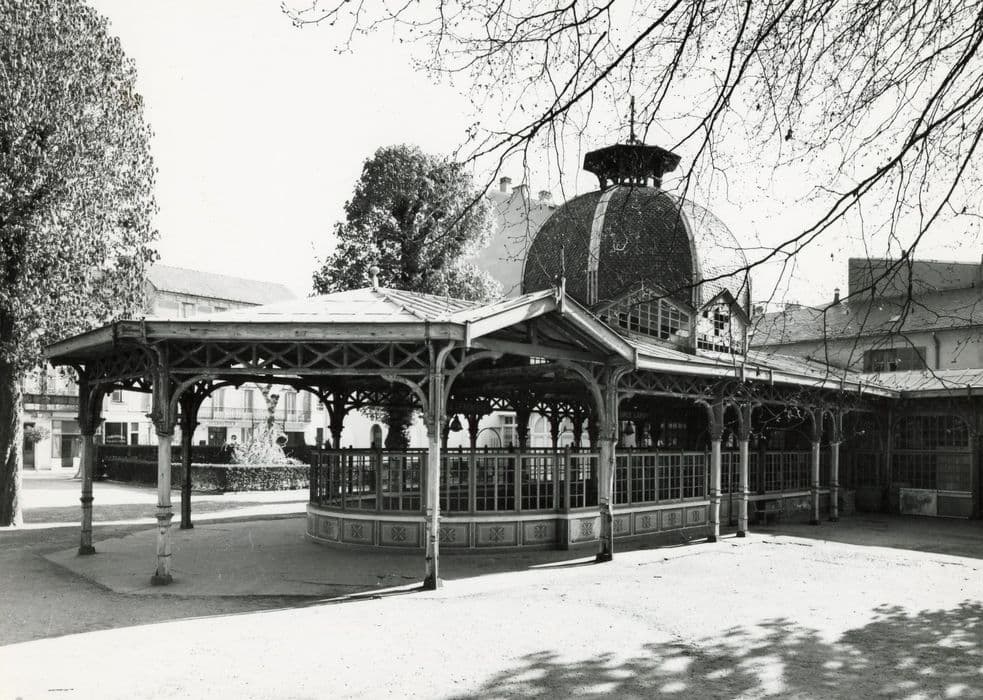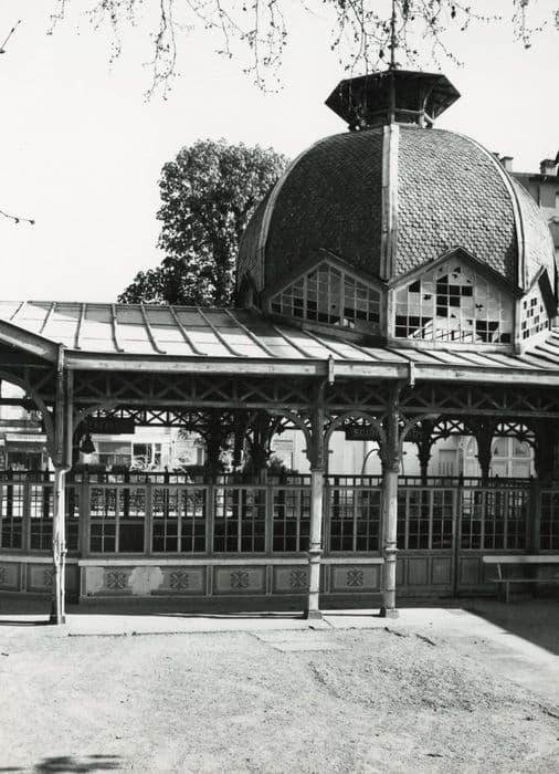 La source Lardy, du nom de son inventeur, fut exploitée à partir de 1848, peu après sa découverte (1844). Les pavillons primitifs étaient de petits édifices en bois recouverts de chaume. Le pavillon actuel a été édifié en 1900. Edifice en bois de plan rectangulaire, terminé au nord par trois pans. L'ensemble repose sur treize piliers de bois. A l'intérieur, un mur clôt les sources et supporte une verrières à petits bois. L'ensemble a un plan en U. Intérieurement et extérieurement, le mur est recouvert de carreaux de faïences aux couleurs bleu, jaune, vert et or. A l'intérieur, deux parties sont délimitées par une différence de niveau, matérialisée par un escalier et une grille en fer forgé. Dans chacune d'elles, un bassin circulaire contenait la source, recouvert de carreaux de faïence de même couleur que les murs extérieurs. La source du fond était protégée par une cloche de verre. A son aplomb a été élevé un dôme hexagonal, couvert en écailles et terminé par un lanternon. Ce pavillon est, à Vichy, l'un des derniers vestiges de ces constructions en bois, architecture de jardin dans la tradition des fabriques.