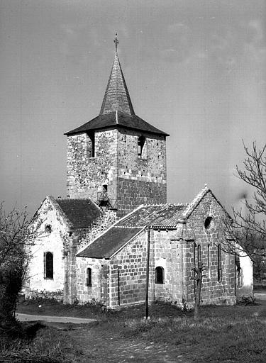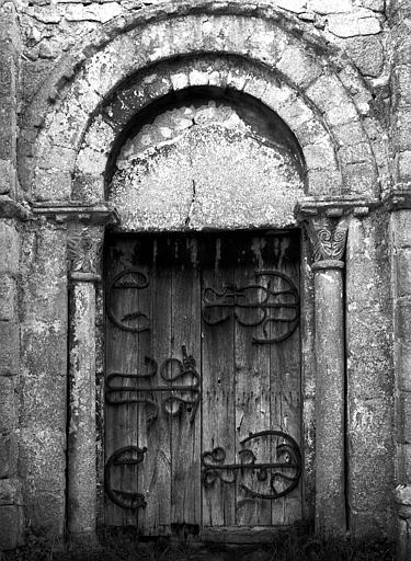 Eglise des 11e et 12e siècles, ouverte au sud par une porte au linteau en accolade ajoutée au 15e siècle. L'édifice comprend une nef de deux travées, terminée par un choeur de deux travées et un chevet plat. Une charpente a remplacé les berceaux en plein cintre primitifs. La façade est surmontée d'un clocher-mur à deux baies. L'entrée primitive s'effectuait à l'ouest par un portail dont l'ouverture rectangulaire est accostée de deux colonnes dont les chapiteaux de feuillages à enroulements supportent le rouleau inférieur de l'arc en plein cintre inscrivant le tympan nu. Les vantaux de ce portail roman ont conservé leurs pentures. Les ferronneries de cette porte représentent des courbes, des têtes de serpents, des feuilles lancéolées, et une représentation humaine stylisée.