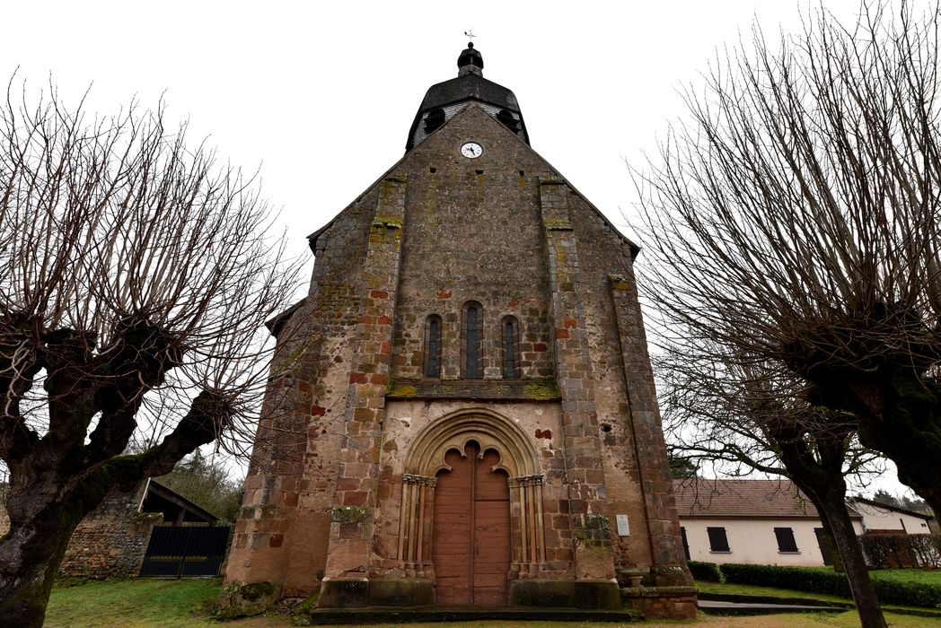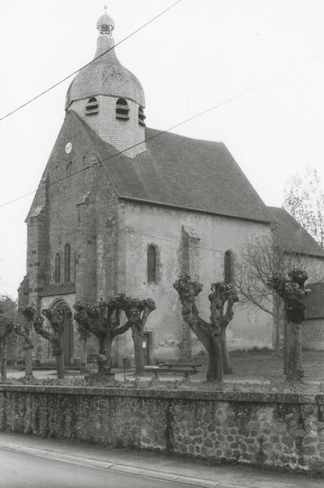 Eglise construite du 11e au 15e siècle, la campagne principale se situant au 13e siècle et correspondant à une reconstruction de l'édifice sur les bases d'un édifice roman. L'église comprend un choeur à chevet plat, accoté d'une nef composée de deux travées, à l'aplomb de laquelle s'élève le clocher. Le choeur, d'origine romane, est couvert par un berceau plein cintre. Chaque mur latéral est percé de deux profondes arcadres plein cintre formant chapelles. Une grande baie d'axe perce le chevet plat. La nef est voûtée d'ogives à profil torique. Les piles séparant les deux travées sont cruciformes, cantonnées de colonnes à chapiteaux ornés de feuillages découpés et de crochets parfois terminés par des têtes. Les bas-côtés, prévus dans le projet de reconstruction du 13e siècle, n'ont pas été réalisés. Tour d'escalier en vis hors-oeuvre accotée au mur nord, desservant le clocher. Le portail principal occidental est marqué par un avant-corps surmonté d'un glacis. Une voussure à trois ressauts successifs retombe sur trois colonnettes par l'intermédiaire de chapiteaux à crochets et feuillages. Le tympan est formé d'un arc polylobé dont l'extrémité des lobes est garnie de petites têtes grimaçantes.