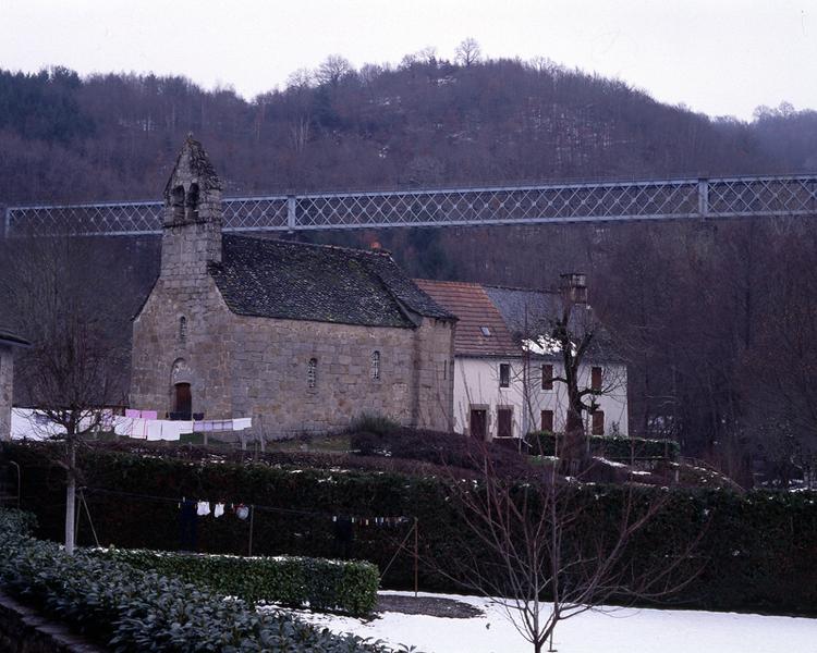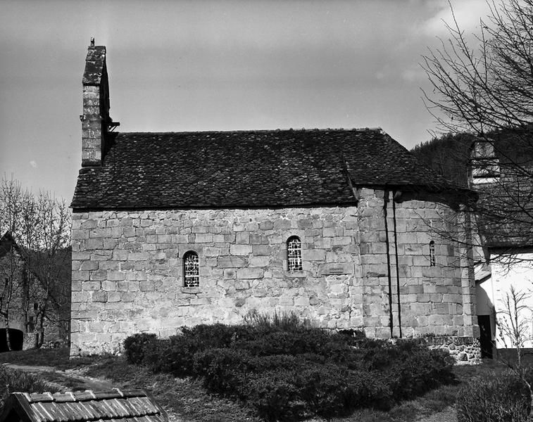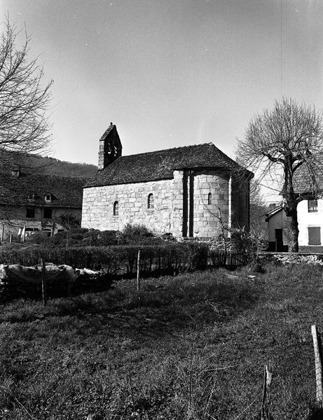 L'importance de l'agglomération et son éloignement du chef-lieu y firent élever un sanctuaire dès la plus haute Antiquité. L'édifice actuel remonterait au début de la période romane, comme en témoigne l'archaïsme des chapiteaux et des bases de colonnes et colonnettes. L'église est formée d'une nef rectangulaire et d'une abside semi-circulaire formant choeur. La nef est recouverte d'une fausse voûte en plâtre, mais dut porter autrefois un plafond ou une charpente apparente. Le choeur communique avec la nef par un arc en plein cintre à double rouleau, reçu par l'intermédiaire de larges tailloirs chanfreinés, sur des pilastres sans bases, le rouleau supérieur tombant en avant sur de petits pilastres cubiques engagés aux angles de la nef. Ces supports forment entre eux un angle où est adossée une colonne surmontée d'un chapiteau sans emploi dont la corbeille est ornée de demi-cercles accotés terminés par une boule, dont la forme est spéciale à l'arrondissement de Mauriac. Les chapiteaux de la fenêtre médiane éclairant l'abside, sont sculptés de deux lions affrontés pour l'un, et le même décor que ceux de l'entrée du choeur pour l'autre. La façade ouest s'ouvre par une porte dont l'arc en plein cintre encadre un tympan de 1778 et présente des chapiteaux ornés. Le clocher-mur se termine en pignon aigu, surmonté d'une croix antéfixe, et est percé de deux baies en plein cintre .