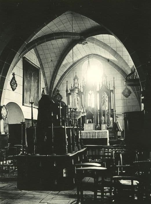Edifice du commencement du 15e siècle se composant d'un choeur carré et d'une nef formée de deux travées légèrement barlongues. Une chapelle a été construite au nord au 15e siècle, et une autre au sud au 17e. Le clocher est formé par le mur pignon ouest surmonté de trois arcades. A l'intérieur, l'église est voûtée d'arêtes nervées. Le portail, abrité sous un auvent, est encadré par deux statuettes représentant l'Annonciation, au-dessus des chapiteaux.
