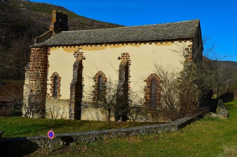 Cette chapelle faisait partie d'un prieuré de l'ordre de la Couronne, à la collation du chapitre cathédral de Saint-Flou. L'édifice, construit en un style étranger à la région, peut remonter au début du 13e siècle. A l'intérieur, nef unique divisée en trois travées par des murs droits. Le portail occidental présente une première archivolte ornée de neuf lobes lancéolés, chacun inscrivant une quinte feuille ajourée. Il se compose également de deux pieds-droits, formant retrait, couronnés d'un chapiteau décoré d'une rangée de perles réunies par un cordon enlacé. Au-dessus de la porte, une rose éclaire la nef.