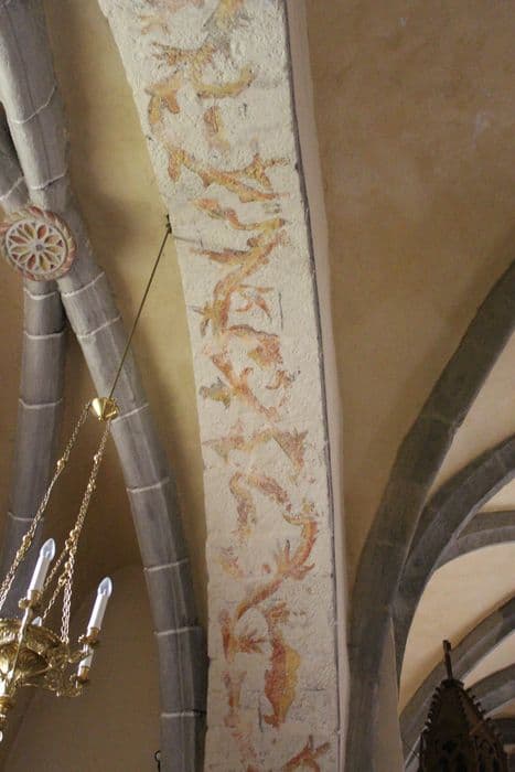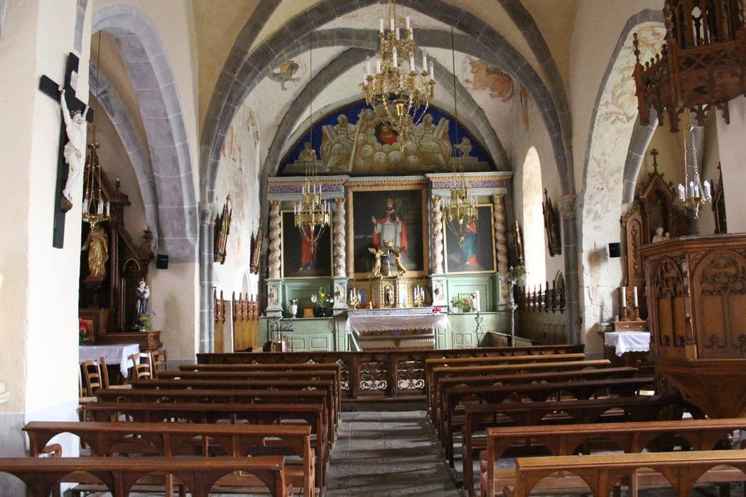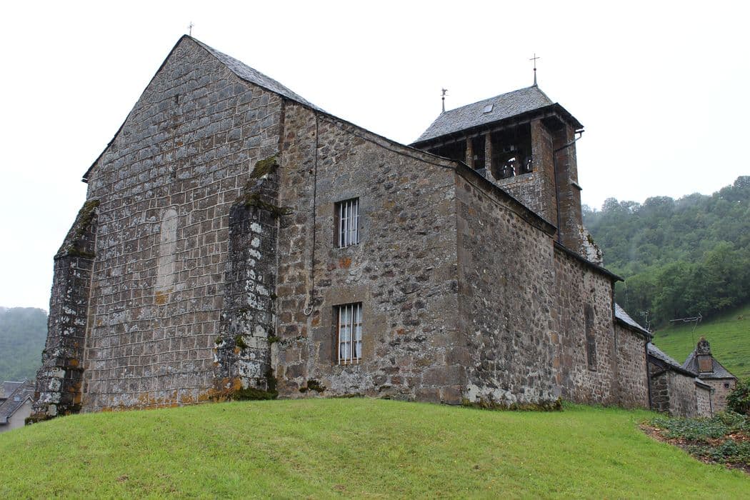 Edifice en tuf volcanique, formé d'une nef de trois travées flanquées de chapelles latérales, d'un porche et d'un choeur à chevet plat. Les deux premières travées de la nef, rectangulaires, séparées par un arc doubleau brisé, sont voûtées d'ogives, avec clefs de voûtes sculptées d'un quatrelobe. Les chapelles latérales sont également voûtées d'ogives. La troisième travée, plus profonde que les précédentes, présente des nervures retombant sur des culots à masques humains. Cette travée communique, par des arcs brisés, avec des chapelles voûtées d'ogives reçues sur des culots sculptés. De part et d'autre de l'entrée du choeur, un faisceau de trois colonnettes engagées surmontées d'un chapiteau sculpté de masques, reçoit les retombées de l'arc triomphal brisé, des ogives de la première travée de la nef et de celles du choeur. A l'extérieur, la façade occidentale est surmontée d'un clocher-mur barlong. Le portail est précédé d'un porche en berceau brisé. La non concordance de l'axe de ce porche, déporté vers l'ouest, avec celui du portail, indique la postériorité de sa construction. Le choeur est orné de peintures, avec les quatre Evangélistes figurés en médaillons aux compartiments de la voûte.