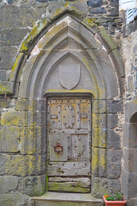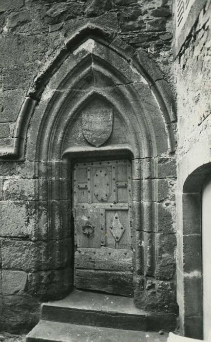 Immeuble formé d'un corps de logis rectangulaire accolé d'une tour d'escalier. La façade en retour de cette tour s'ouvre, au rez-de-chaussée, par une porte au seuil surélevé de deux marches, dont les piedroits et l'arc brisé inscrivant un tympan chargé d'un écu, sont moulurés de deux tores dégagés par des cavets et reçus sur bases prismatiques. A l'archivolte fait saillie un cordon en larmier formant, de part et d'autre, retour horizontal. La porte, aux angles supérieurs arrondis sous un linteau profilé d'un listel dégagé par deux cavets, est fermée par un vantail formé de panneaux assemblés en des cadres au moyen de clous en fer forgé. Dans le panneau central supérieur s'inscrit un octogone. Les deux panneaux sous ce dernier sont chargés, l'un d'un losange, l'autre d'une poignée en fer forgé formant heurtoir.