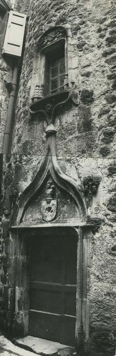 Le rez-de-chaussée de la tour circulaire renfermant l'escalier à vis s'ouvrent par une porte avec, au-dessus, une fenêtre, unies entre elles par un décor d'accolades. Les piedroits sont ornés de moulures prismatiques d'où se dégage un tore chargé d'un filet reçu sur bases prismatiques. Le linteau est également mouluré d'un tore chargé d'un filet dont les extrémités s'épanouissent de part et d'autre en feuilles découpées et frisées. Au-dessus de ce linteau, un tympan sculpté en son milieu d'écu bûché que surmonte une Vierge couronnée en buste, portant l'Enfant, est inscrit sous une accolade aigüe moulurée. De part et d'autre de cet arc d'encadrement du tympan sont sculptés deux bouquets de feuilles à trois lobes et de grappes.