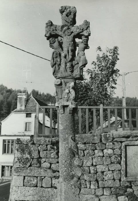 Croix du 15e siècle, érigée le long d'un itinéraire secondaire du pélerinage de Saint Jacques de Compostelle. L'ouvrage, en lave, se compose d'un emmarchement à deux gradins sur lequel est posé un bloc monolithe cubique, dont la partie supérieure est délardée en cavet renversé. Le fût de la croix et le croisillon sont sculptés dans deux blocs distincts. A mi-hauteur, le fût est orné d'une sculpture représentant le donateur agenouillé et accompagné d'un phylactère. Sur la hampe, saint Just, évêque de Lyon et patron de la paroisse, entouré de deux bergers, repose sur une corniche qui pourtourne la base de la hampe. La croix est à traverses courtes et fleuronnées. La face principale représente une crucifixion, avec le Christ et les deux larrons, la Vierge, saint Jean s'essuyant le visage avec son manteau et sainte Madeleine. Le revers représente la Vierge à l'enfant avec une Nativité : Vierge, saint Joseph, l'âne, le boeuf et le berceau en osier. Cette croix se distingue par son iconographie originale.